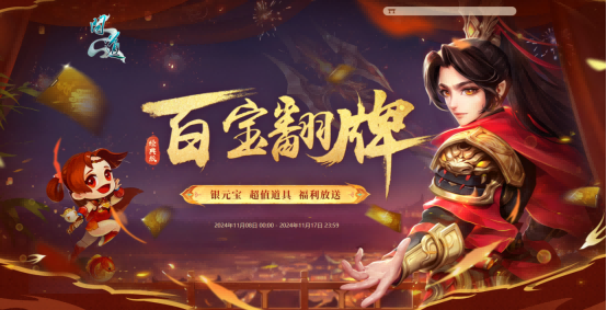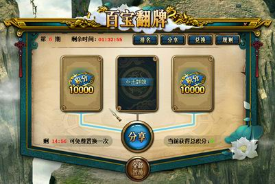 活动期间,可以在游戏界面右上角点击“百宝翻牌”按钮参与活动。通过将三张图片凑成同一图案,便有机会赢得元宝、道具、积分等多种奖励。