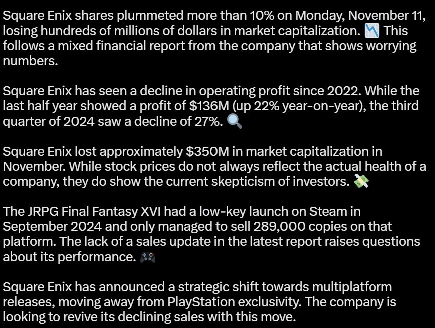 SE于2023年6月在PS5上推出《最终幻想16》后,其销量还算不错。2024年9月,该作终于登陆PC,以吸引更多玩家。然而《最终幻想16》PC版表现很差,远低于SE预期。