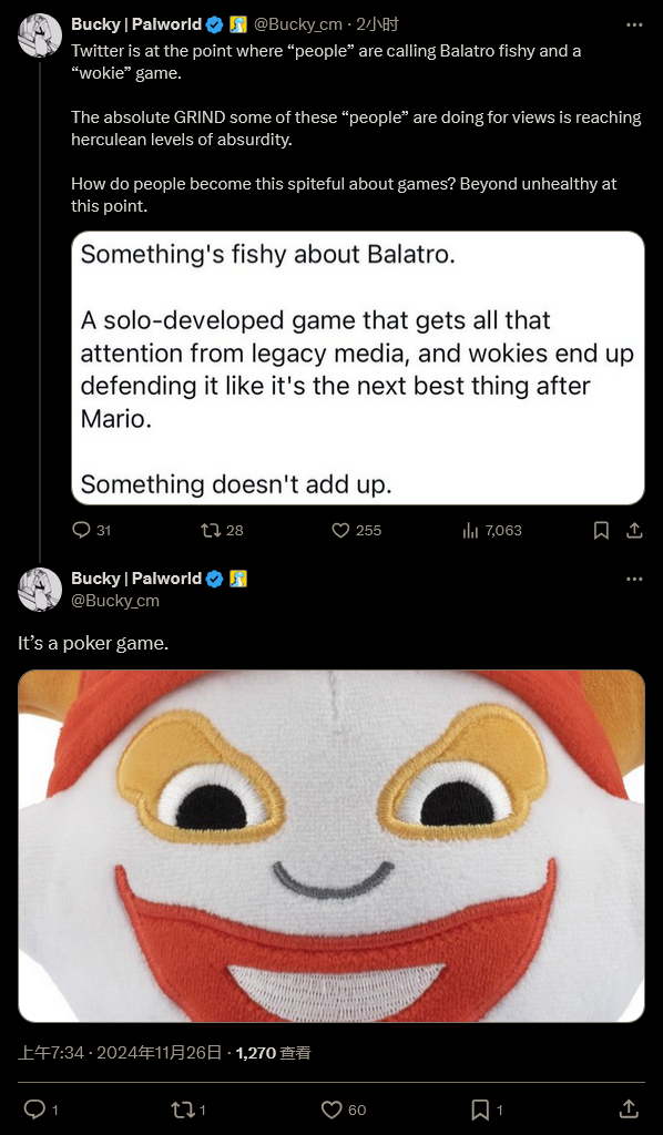 同样是热门游戏的《幻兽帕鲁》的社区经理就在社交媒体上特别提到了其中一位网友的论调。这位网友显然并没有像许多其他人一样被《小丑牌》的魅力所折服,而是认为它获得这么多游戏媒体以及许多“正确”人士的维护,是因为它本身也有“正确”要素。