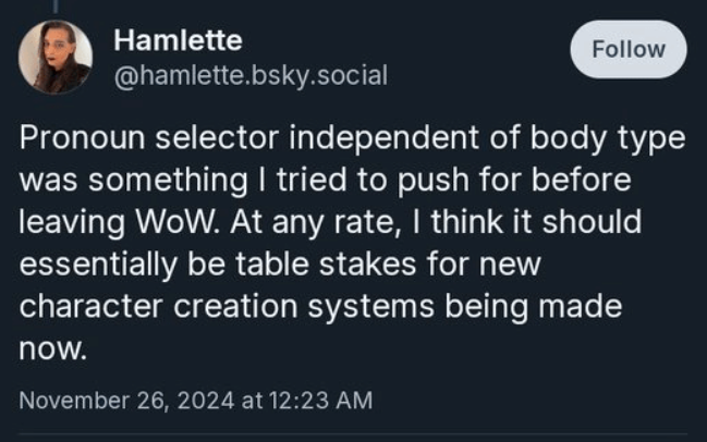 更令人没想到的是,这件事还炸出了一些潜水的隐藏大鱼。一位前暴雪员工在X上支持起了黑曜石的做法,为此她还表示:“独立于身体类型的性别代词选择是我在离开《魔兽世界》之前尝试推动的东西。无论如何,我认为这应该成为现在角色创建系统的必备元素。”