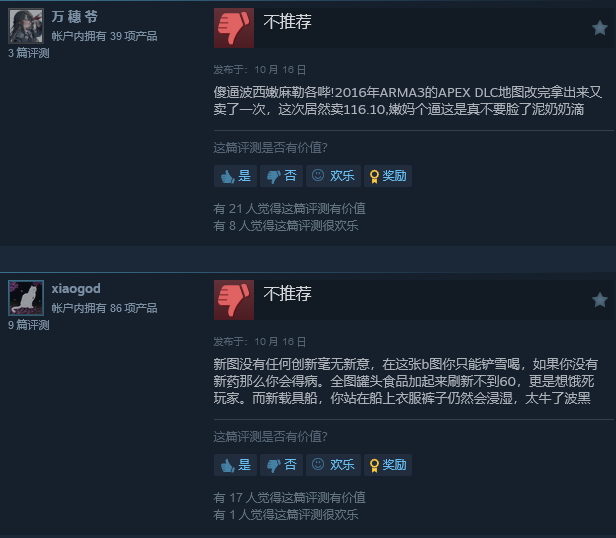 在 Steam 上过去 30 天里,DLC 的差评率高达 77%,目前好评率仅为 48.33%(多半差评)。当然,玩家的批评原因多种多样,但大多数都是在抱怨游戏的定价为 26.99 美元的同时,没有玩家认为物有所值的内容。一些玩家提到,即便《DayZ》游戏本身性价比很高,但 DLC 仅一张地图就接近于游戏本体的价格,这相当于是在“浪费钱”。也有玩家指出,新的地图就是《武装突袭3》中已有地图的重制版本,这让人觉得定价相当不值。