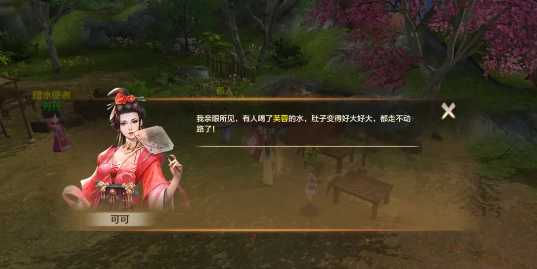 好好看路人的提示是关键,只有一个人的水能喝,若少侠能耐心读完所有提示,定能做出正确的选择。