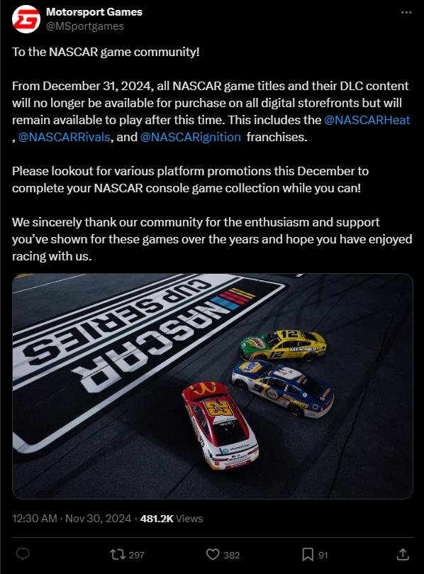 近日Motorsport Games官方宣布,将从2024年12月31日起,下架所有的《纳斯卡》系列游戏及DLC内容。届时玩家将无法从数字商城中购买到相关产品,已购买的玩家则可以继续游玩。