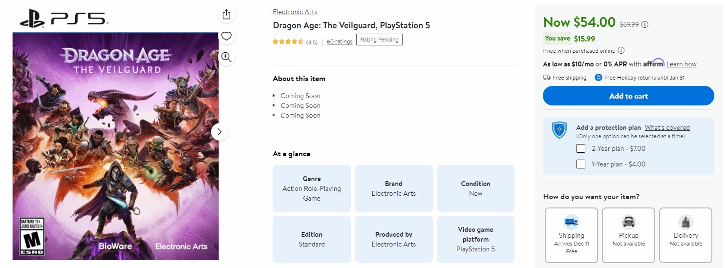 《龙腾世纪4:影障守护者》自发售后便备受争议,销量也不太好。近日据外媒Gamesradar报道,该作发售不到一个月,PS5版就开始在亚马逊上打折促销,从原价70美元降至54美元。