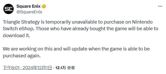 根据SE官方发布的消息,《三角战略》目前已从Switch美服eShop下架,暂时无法购买,已购买的玩家可以正常下载游玩,官方称他们正在努力解决这个问题,游戏恢复购买的时间将另行通知。