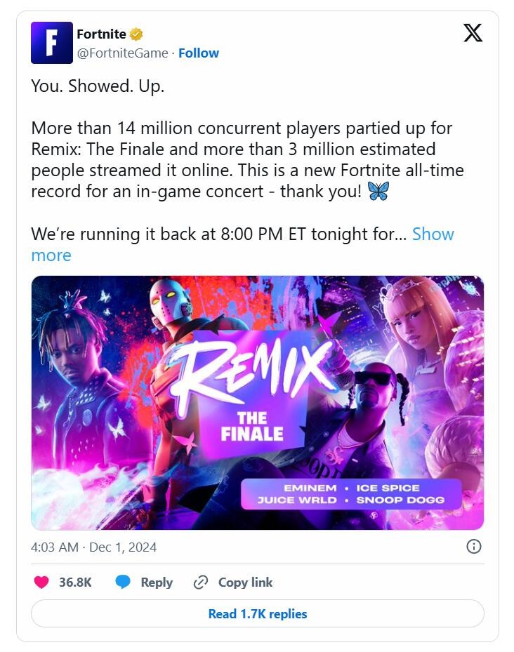 游戏最近举办了 Remix:The Finale 音乐活动,这是一场由史努比狗狗、艾米纳姆、Ice Spice以及已故的Juice Wrld主演的游戏内音乐会,规模非常庞大。Epic Games在推特上透露,在活动期间,《堡垒之夜》的同时在线玩家人数峰值超过了1400万,这是《堡垒之夜》在游戏内音乐会期间同时在线玩家的新纪录。除了游戏内的同时在线玩家外,该活动还通过网络吸引了超过300万观众进行观看。
