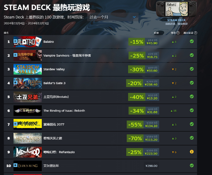 那么玩家们在体验Steam Deck时,又会更加偏爱哪些游戏呢?对此,Steam官方公布了11月份的Steam Deck游戏时长记录,排名前十的作品如下——