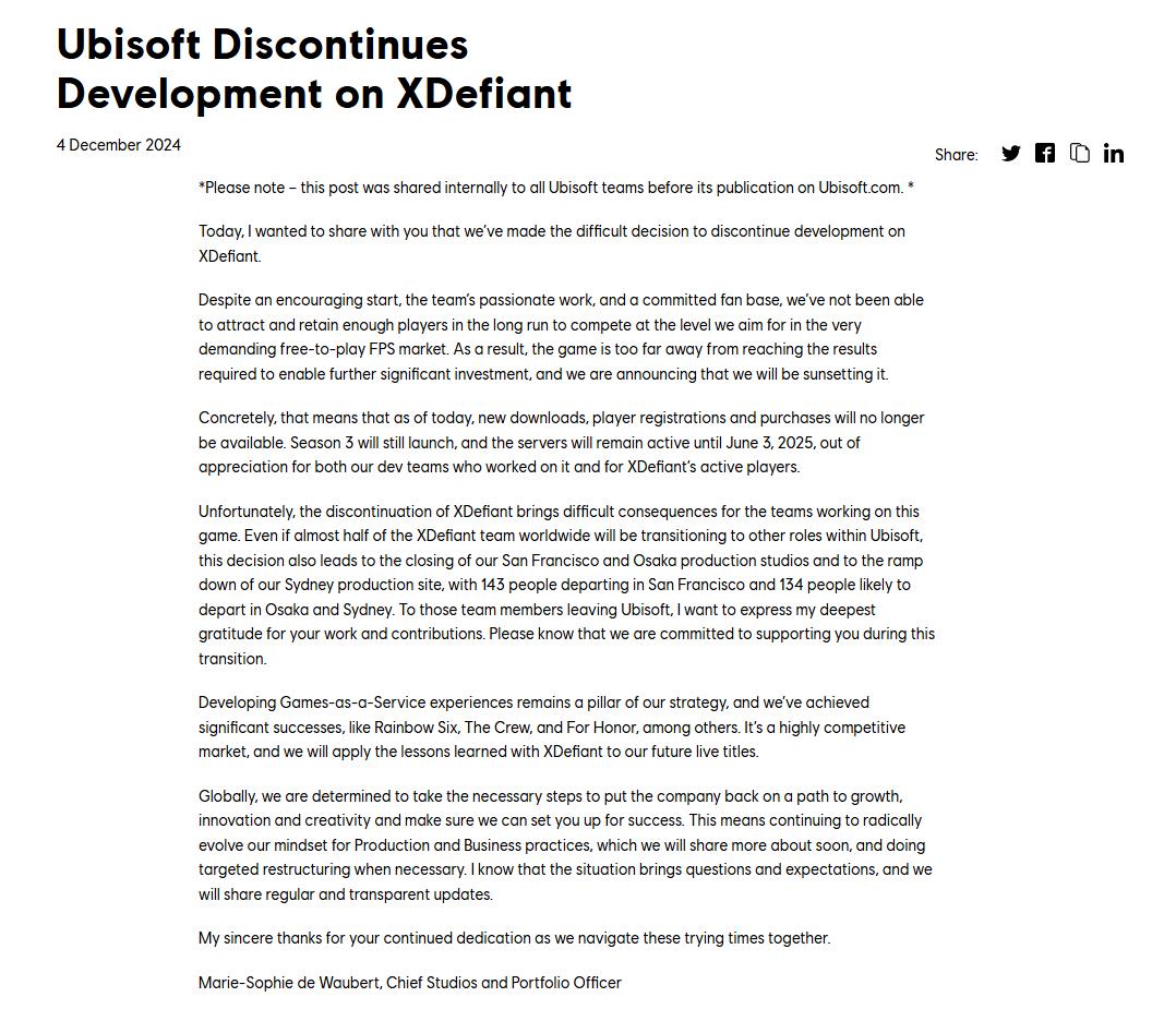 对此de Waubert表示:“尽管开局令人鼓舞,团队充满热情,粉丝群也很忠诚,但从长远来看,我们无法吸引和留住足够多的玩家,无法在竞争激烈的免费FPS市场中达到我们预期的水平。这款游戏距离达到进一步投入大量资金所需的结果还很遥远,我们宣布将停止这款游戏的开发。因此从今天起,新的下载、玩家注册和购买将不再可用,但第3赛季将按计划启动,服务器也将保持在线状态,直到2025年6月3日。”