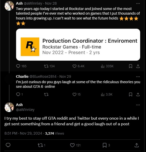 工作室的环境项目协调员 Ashley Winstead在社交媒体上庆祝自己在 R 星工作了 2 年上,在回复游戏粉丝提问时分享称,一些《GTA 6》的粉丝理论是在有些太超乎所以,即便她平时尽量避免看相关的内容,也经常会被朋友分享一些“有趣”的理论。而她则忍不住对这些理论笑出声来。不过她也澄清,自己很喜欢这些粉丝提出的各种“推理”。