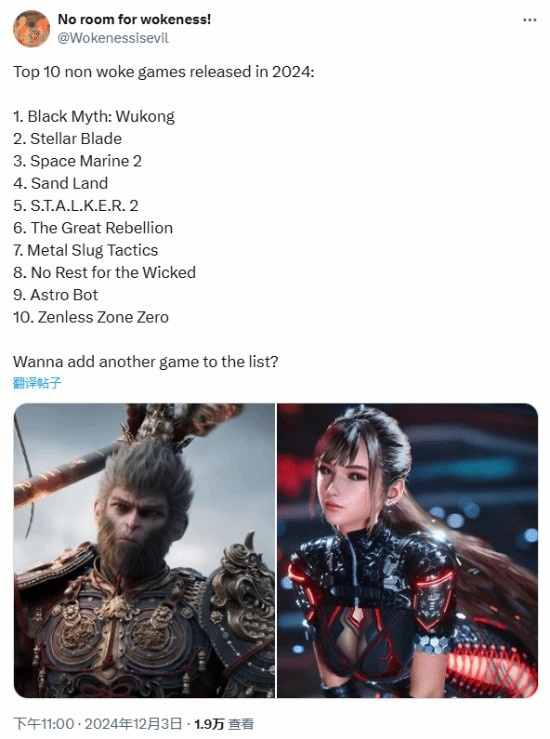 随着2024年即将收尾,外网的知名博主Wokenessisevil带来了一份排行,列举了十大最不“正确”的游戏。它们没有故意丑化角色、没有设置各种奇怪的性别和刻意加深肤色,叙事上也简单直接符合常理。并且它们中的大部分,都取得了不错的市场表现。