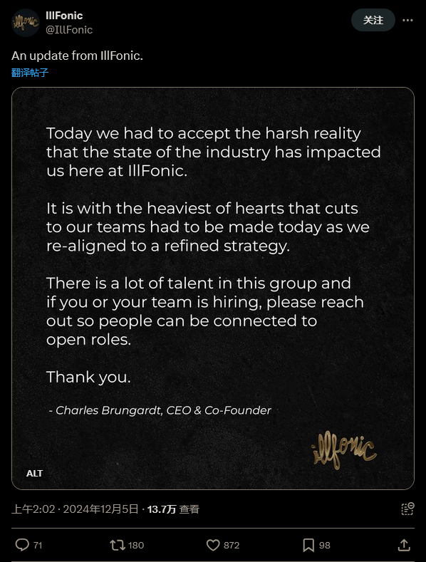 开发商首席执行官兼创始人之一 Charles Brungardt? 在社交媒体上写道:“今天,我们不得不接受残酷的现实,即行业现状对我们 IllFonic 产生了影响。今天我们怀着沉重的心情对我们的团队进行了裁员,作为我们对战略进行进一步完善的一部分。”