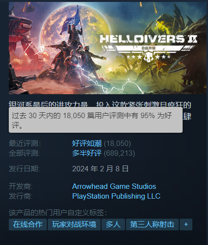 在过去的30天里,《绝地潜兵2》收到了1.7万条评价,其中好评率高达95%,彻底扭转了之前的口碑。要知道,在今年8、9月份的时候,许多玩家恨不得它能原地停服。