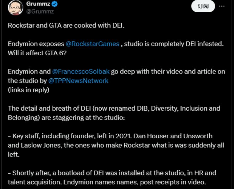 玩家们对《GTA6》的期待之高无以复加,默认这会是一款新的划时代作品。然而,近期国外知名的反DEI博主、前魔兽制作人Grummz,却带来了一则可能大家并不太愿意相信的观点——R星可能已经受到DEI(多样性、公平性、包容性)文化的影响了。
