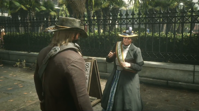 在R星的上一部原创作品《荒野大镖客:救赎2》中,开发者就刻意加入了与女权卫士、动保组织相关的NPC角色。她们一个出现在圣丹尼斯的街头,一个出现在蓝水沼泽的深处。