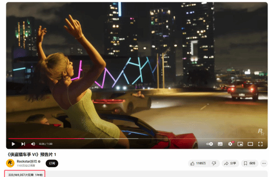 2023年的12月1日,广大玩家们盼来了一条梦寐以求的预告片。由R星制作的开放世界游戏《GTA6》,首次公布了预告片。这场条预告片随后得到了玩家的疯狂点击,迄今为止在油管上已经播放了超2.2亿次。但令人遗憾的是,在后续1年里就再没有与之相关的消息了。