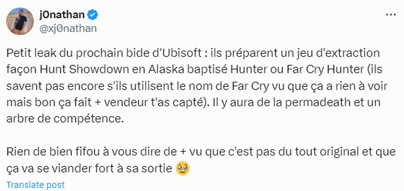 近日法国游戏博主j0nathan发推文称,育碧在开发一款名为《Hunter》或《孤岛惊魂Hunter》的新作。但这款游戏与《孤岛惊魂》系列没太大关系,因此育碧还在考虑是否用《孤岛惊魂》IP来命名。这款游戏将有永久死亡模式和技能树。
