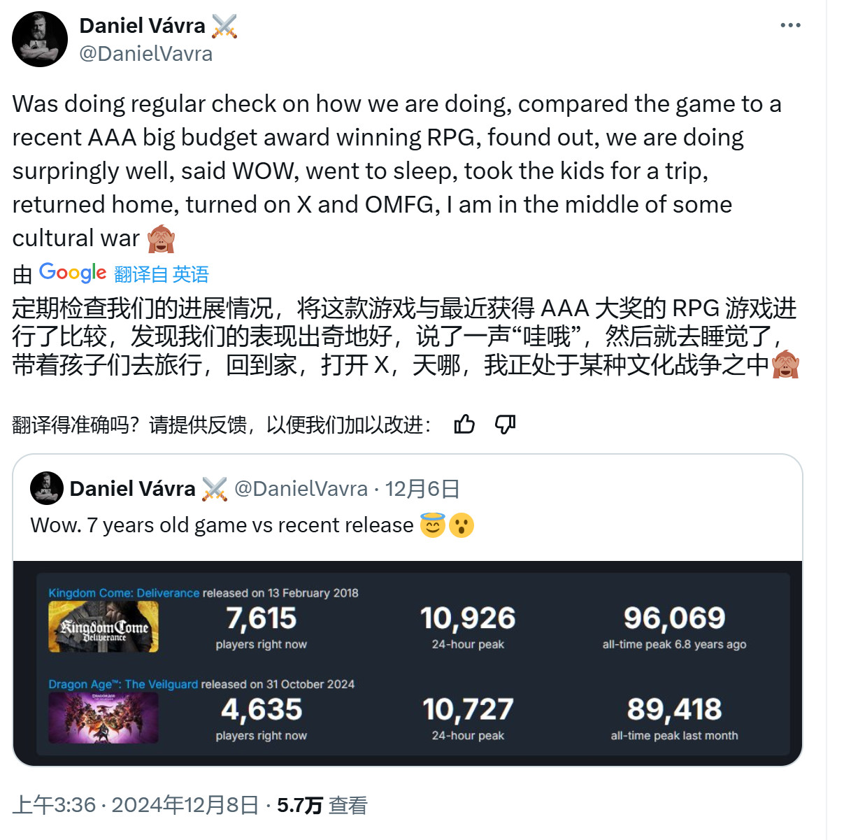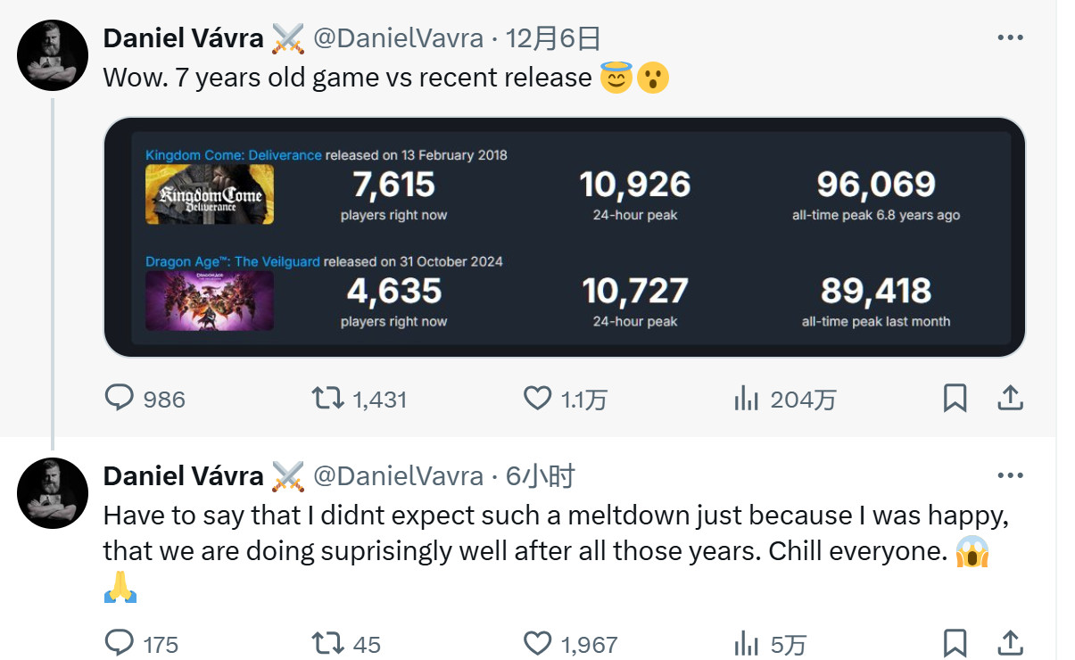 昨天,《天国:拯救》的主创Daniel Vavra发推,略带嘲讽了BioWare最近发售的大作《龙腾世纪:影障守护者》。他发帖对比了两个游戏的在线数据,暗示《龙腾世纪:影障守护者》的在线人数甚至不如7年前的《天国:拯救》。