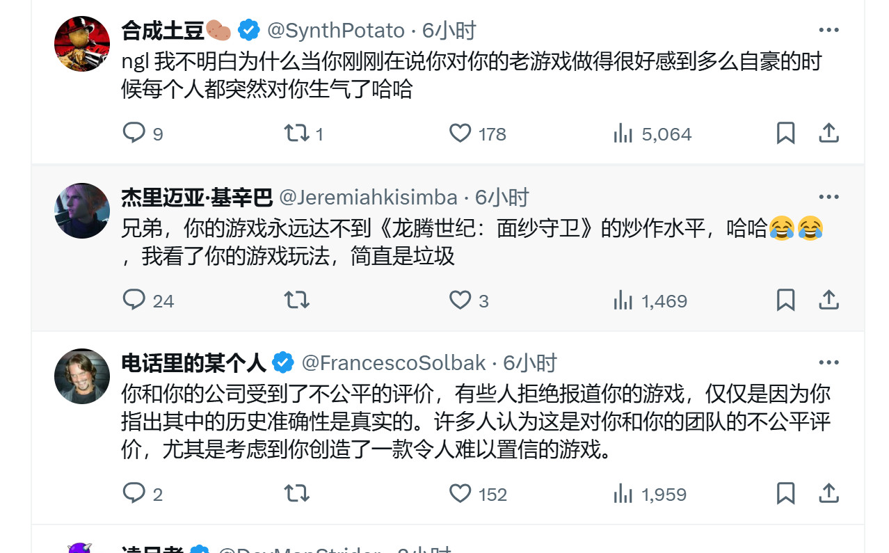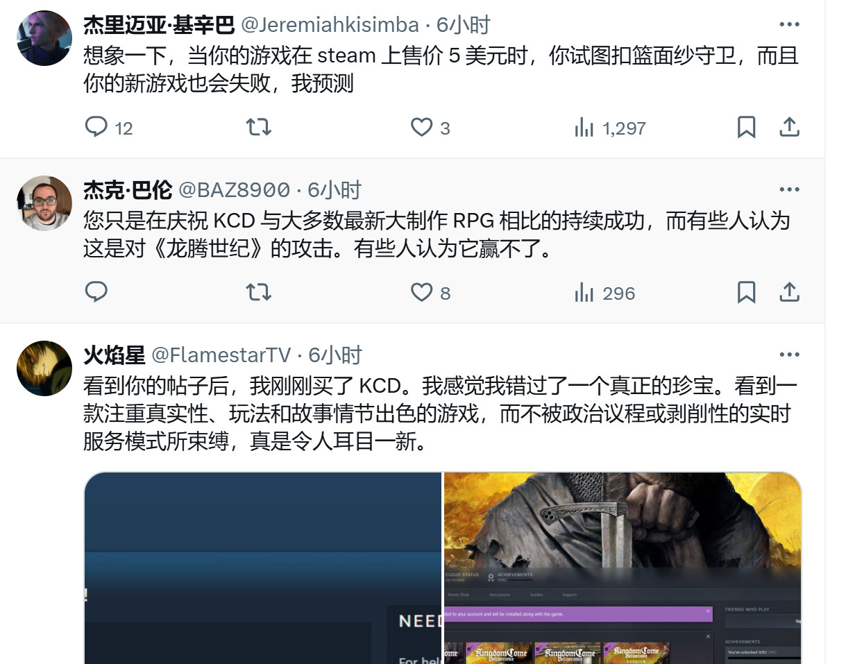 他说:“我定期检查我们的工作情况,将我们的游戏(《天国:拯救》)和最近获奖的一款3A RPG进行了对比,发现我们做得出乎意料地好,我很惊讶。然后就去睡觉了,带着孩子们出游,回到家打开X,我勒个擦,发现我自己卷入了一场文化战争之中。”