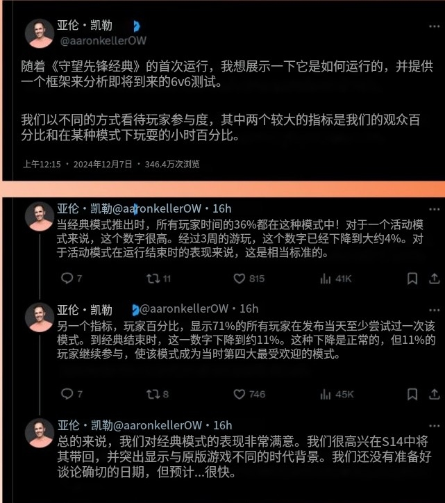 时隔一个月,在此《守望先锋2》的经典模式上线一个月之际,Aaron Keller又公布了后续的计划。他表示,在该模式上线之后,71%的玩家在发布当天至少尝试过一次该模式。36%的玩家游戏时长,也被投入到了怀旧模式当中。