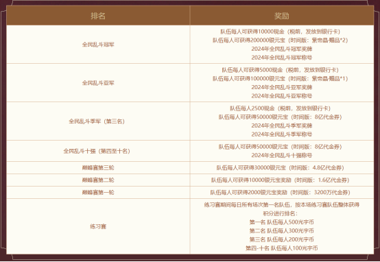 巅峰赛共分为三轮,在第一轮、第二轮的巅峰赛中,每个赛场坚持到最后的5支队伍,可以获得下一轮的参赛资格。而在周日举办的入围第三轮巅峰赛,将是本次全民乱斗的总决赛,所有进入赛场的强者,将会争夺丰厚的冠军奖励。冠亚季军队伍每人可以获得超多现金,银元宝(时间版为紫帝晶或代金券),以及十分精美的2024年全民乱斗奖牌和称号奖励。