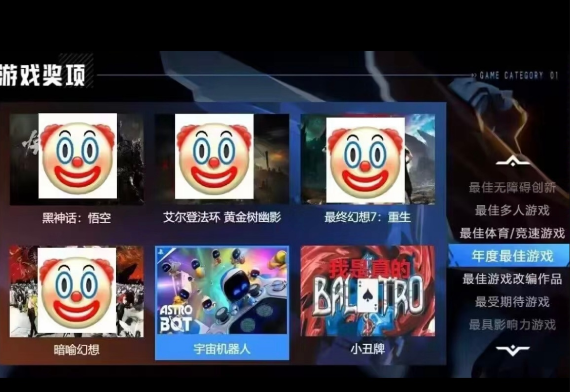 当然,本届TGA的槽点并不止这些。因为一些奖项的评选太过离谱,已经组成了笑话合集!譬如因为以DLC的身份提名年度最佳游戏被喷了一个月,结果却颗粒无收的《黄金树幽影》。