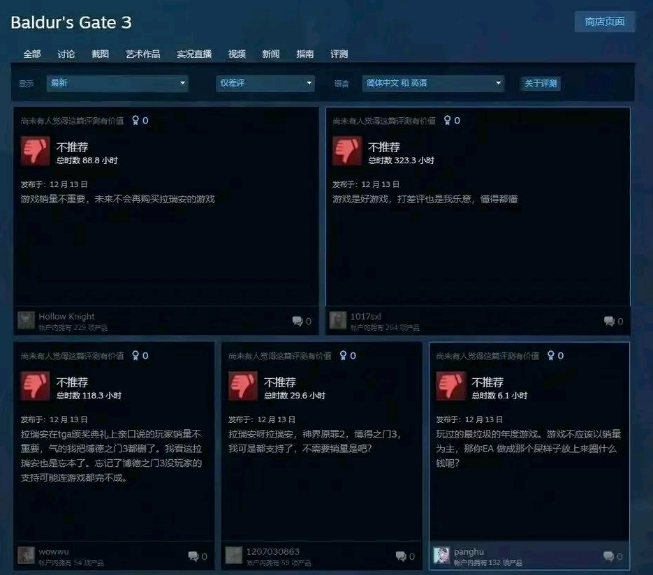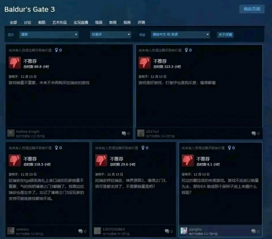 这场席卷整个互联网的风暴,最终在游戏口碑方面有了具象化的表现。但大家意想不到的是,率先被刷差评却是去年的TGA年度最佳游戏《博德之门3》。当前在Steam平台,已经有很多玩家给出了不推荐的评价。