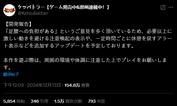 ·官方回应称,已经收到了玩家的关于足腰疲劳损伤的反馈,将很快发布新更新,加入关于适度游戏谨防损害足腰的游戏中提示,而且提醒玩家注意游戏时的周围环境妨碍。