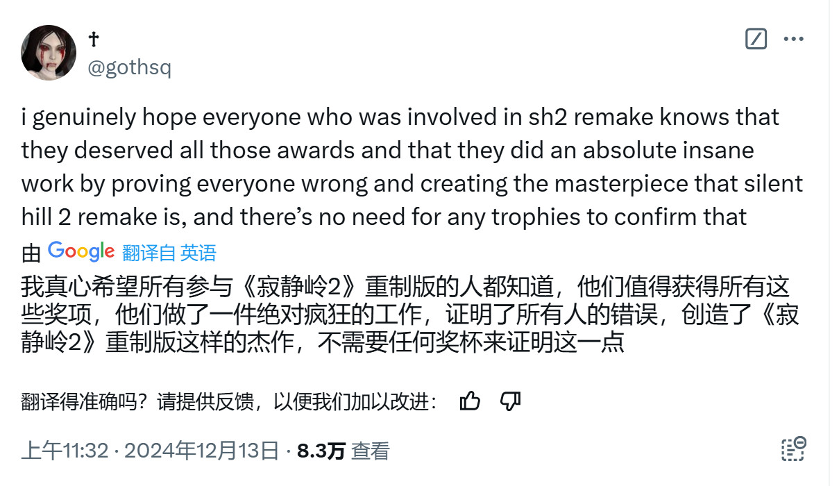 X上一名粉丝表示:“我真心希望所有参与过《寂静岭2》重制版的人都知道,他们理应获得所有这些奖项,他们做了一件绝对疯狂的事,证明了所有人都错了,并创造出了《寂静岭2》重制版这部杰作,这一点无需任何奖杯来证明。”