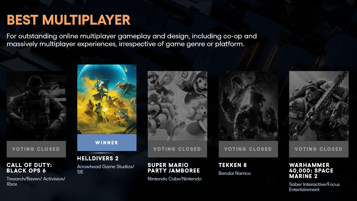 荣获了TGA 2024最佳多人游戏和最佳持续运营奖项(还获得了几项金摇杆奖)的多人合作射击游戏《绝地潜兵2》,算得上是2024年最出人意料的热门游戏之一。