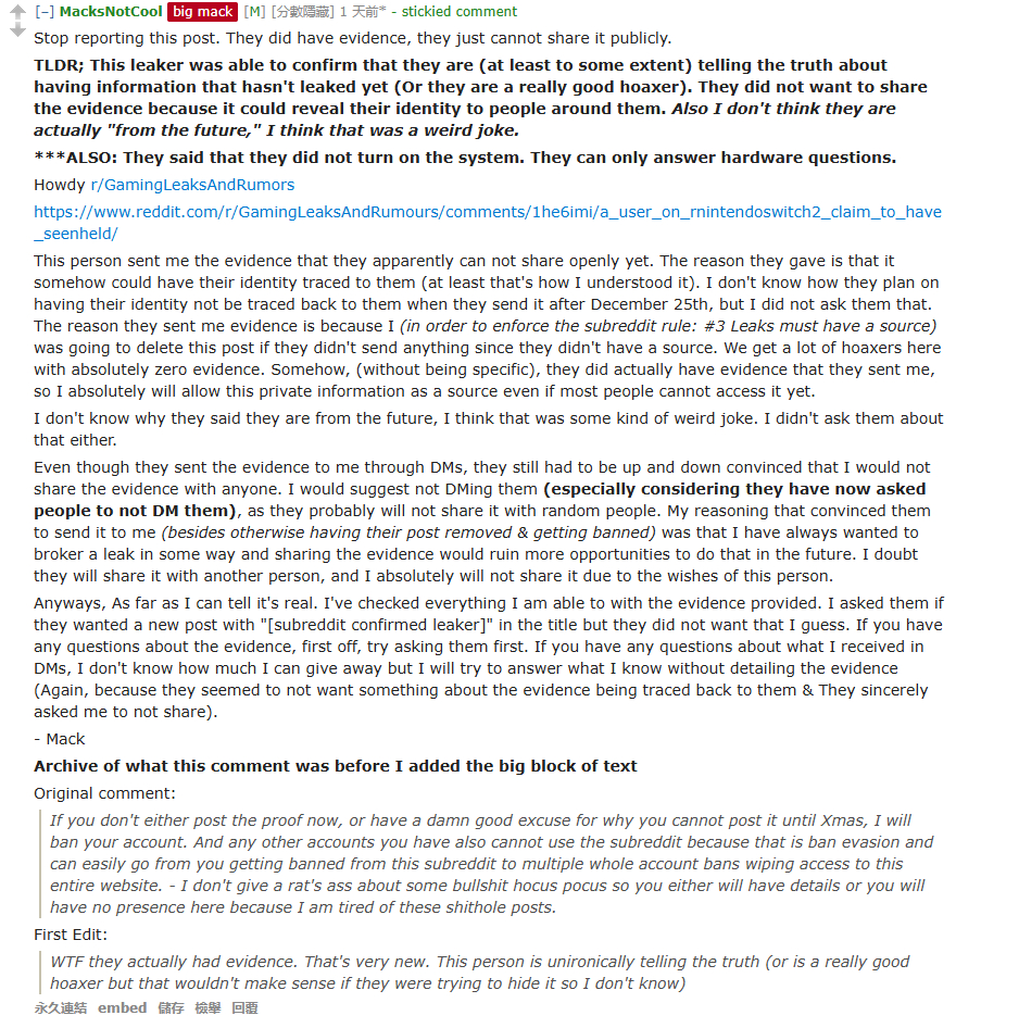 目前,NintendoSwitch2版主已经发布通知告知网友不要再举报该贴文,也不要私信爆料人讨要Switch 2的图片,爆料人会按照承诺在圣诞节公布证据。