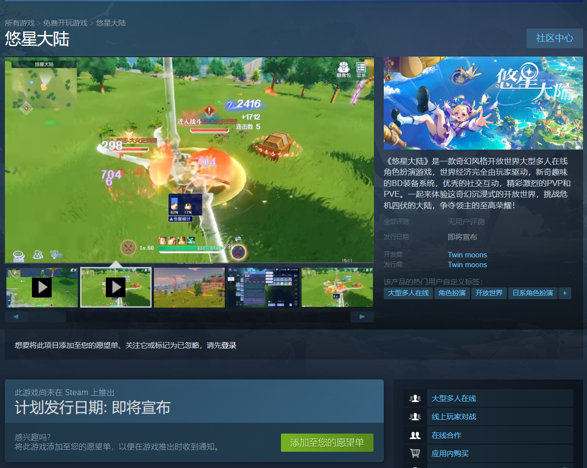 今日,大型多人在线游戏《悠星大陆》steam商店页正式发布,这是一款开放世界MMO游戏,可以自由探索,采集打造,超过一亿种装备Build搭配,PVP/PVE/GVG等,而且现在即可添加到愿望清单,与好友一起来探索未知的悠星大陆世界吧!