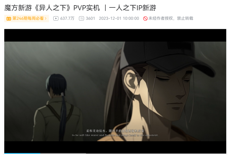 2023年12月1日,由魔方工作室群工作室群开发的《一人之下》IP漫改动作游戏异人之下游戏,公布了首个PVP实机预告片,随后迅速在B站斩获了超600万播放量。以功夫巨星李小龙的“水之哲学”为开篇,随后引出了漫画中的两大人气角色王也、诸葛青的面对面较量。