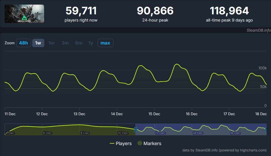 ¡¡¡¡12ÔÂ5ÈÕ¡¶Èý½ÇÖÞÐж¯¡·(Delta Force)ÔÚSteamºÍEPICµÈƽ̨¿ªÆôÈ«Çò¹«²â¡£ÏÖÔÚ¾ÝSteamDBÊý¾ÝÏÔʾ£¬¡¶Èý½ÇÖÞÐж¯¡·SteamͬʱÔÚÏßÈËÊý·åÖµ´ïµ½118964ÈË£¬±íÏÖÏ൱²»´í¡£