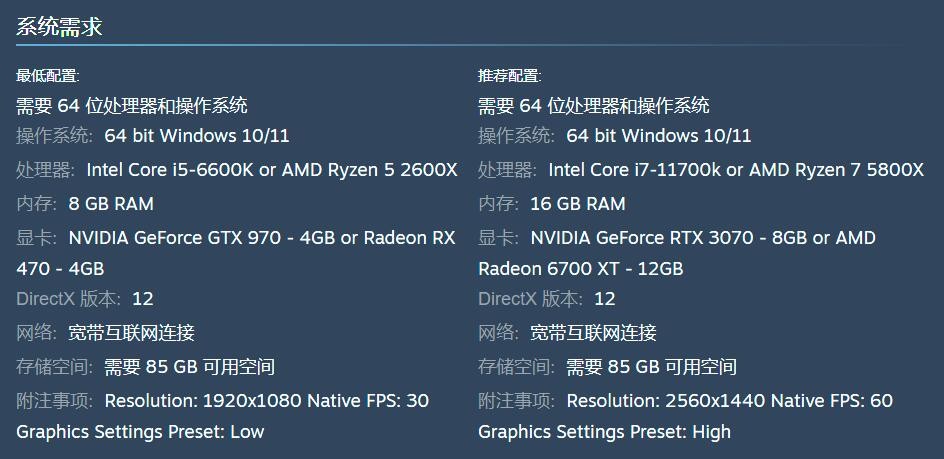 对于在1440p/高画质下以60FPS进行游戏,开发者给出的推荐位置为Intel Core i7-11700k或AMD Ryzen 7 5800X处理器,搭配16GB内存和NVIDIA GeForce RTX 3070或AMD Radeon 6700 XT显卡。游戏还需要85GB的可用磁盘空间。