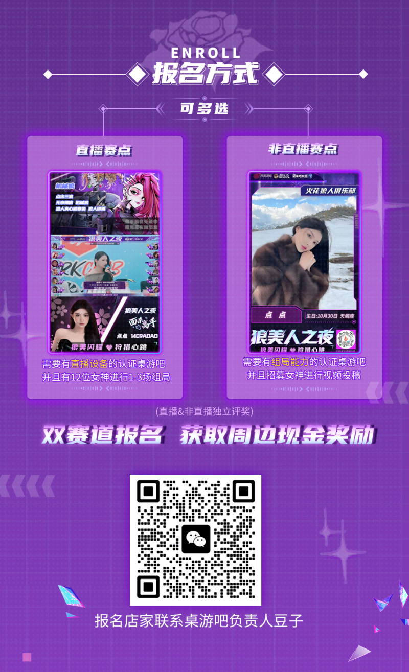 本次活动桌游吧报名时间为2024年12月8日—2025年1月12日,桌游吧店家可扫描下方二维码联系狼人杀官方桌游吧联盟负责人进行认证,并报名活动。有直播设备、且有12位女神进行组局的桌游吧可选择直播赛点,有组局能力且能招募女神投稿的桌游吧可选择非直播赛点,有条件的桌游吧也可两种赛道都选择。