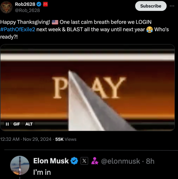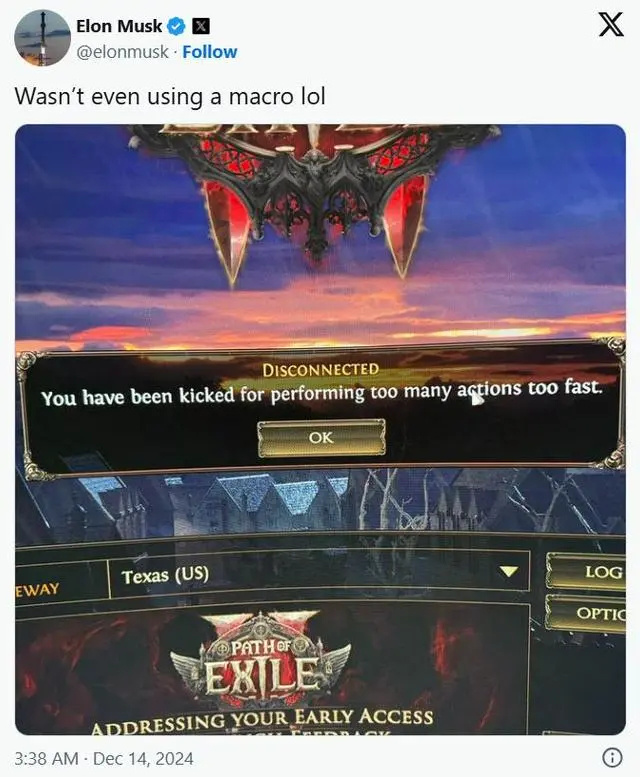 早在《流放之路2》官宣开服首日,钟爱ARPG刷宝游戏的世界首富埃隆马斯克,就宣布了自己的加入。