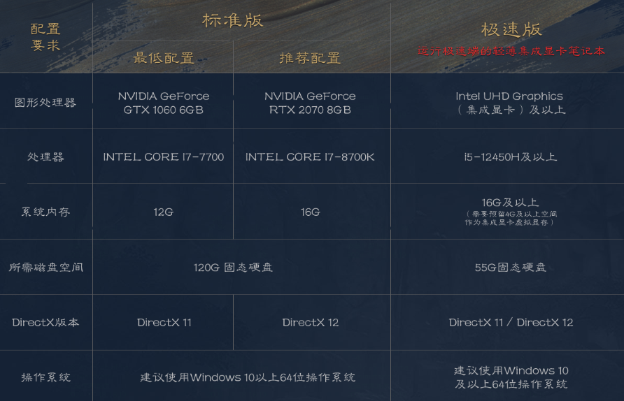 标准版客户端更适合对游戏画面、帧数有更高要求的极客玩家。而极速版客户端则是最大程度压缩了客户端体积及对硬件配置的要求,包体大小仅有40G、可在集成显卡上流畅运行。