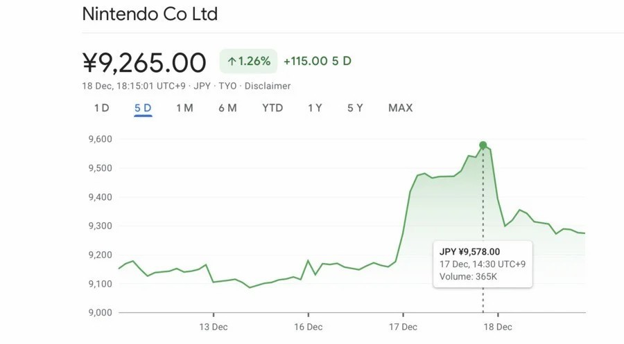 随着人们对Switch 2的期待日益增加,任天堂的股价在2024年12月17日创下了9578日元的历史新高,收盘价为9490日元。