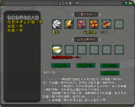 2025年1月1日-2025年1月8日期间,大侠参与游戏副本还能额外获得【腊八粥材料包】,开启获得制作各种制作腊八粥的材料,可根据配方制作各式腊八粥了。