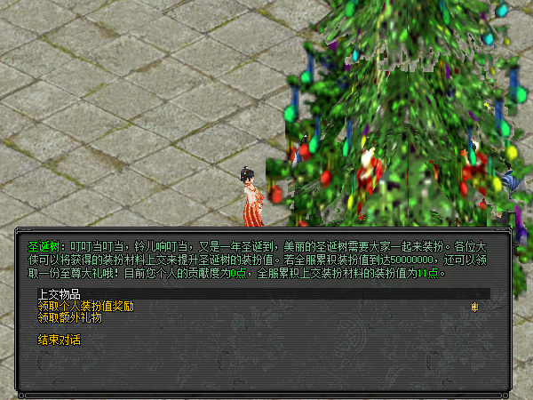 活动介绍:活动期间,大侠参与游戏副本可额外获得装扮材料,前往成都一同装扮圣诞树,即可收获圣诞节日好礼。
