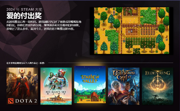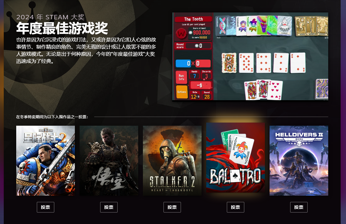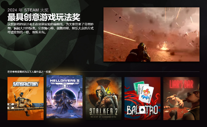 Steam冬促已于今日正式开启,同步开放的还有Steam年度大奖的投票通道。从即日起到2025年1月1日,所有的Steam玩家都可以为自己支持的作品投出宝贵的一票。并且这场评选,完全是由玩家决定结果的。
