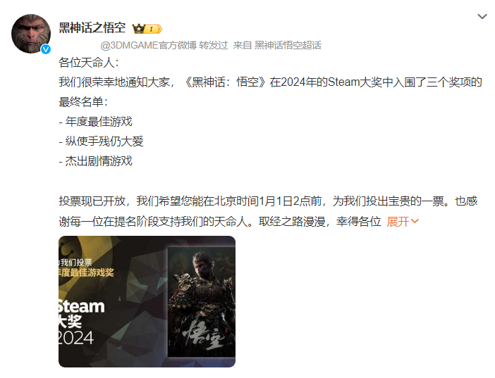 就在今天下午,《黑神话:悟空》官号的开发商游戏科学,都在互联网上为自家游戏拉票。作为首款国产3A游戏,《黑神话:悟空》获得了年度最佳游戏、纵使手残仍大爱、杰出剧情游戏三项奖项提名。