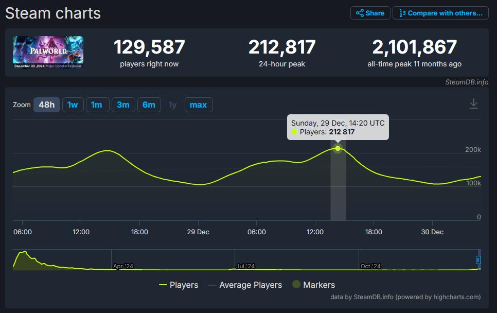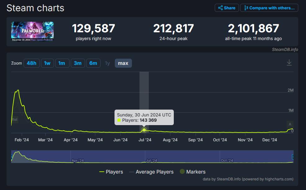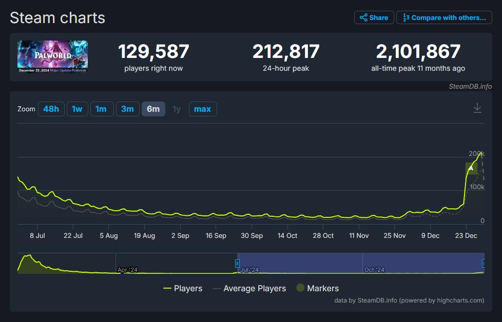 根据SteamDB的数据显示,“天坠之地”推出后在12月29日这天,《幻兽帕鲁》的同时在线玩家人数最高为212817人,这是继游戏6月推出“樱岛”更新后玩家数再度突破10万(当时最高峰为14万,更新推出前后在线峰值稳定在2万至5万之间)峰值。