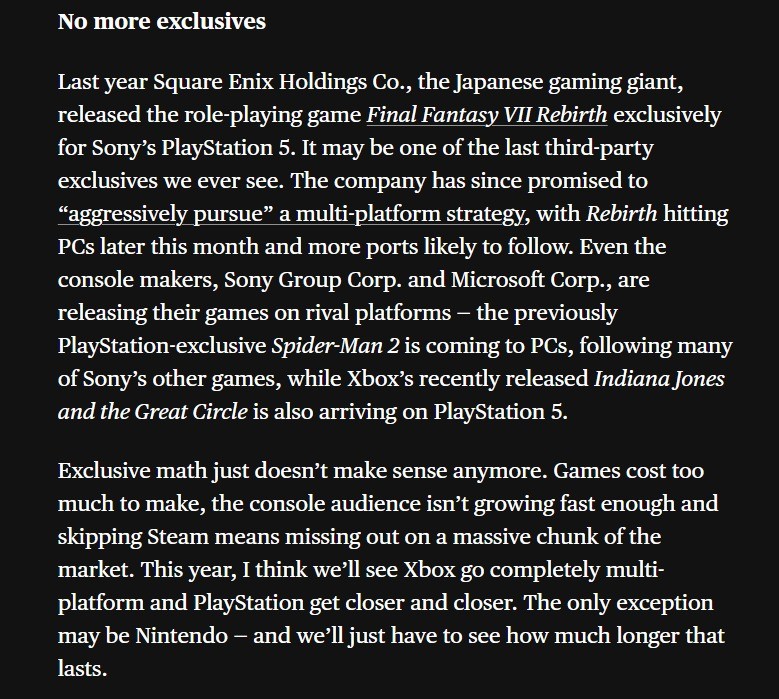Schreier说:“2025年我们将看到微软全面向多平台发展,而索尼也将逐渐减少独占作品。任天堂在短期内并不会效仿此举措,但这种策略可能不会持续太久,随着开发成本的增加,任天堂可能不得不重新评估其策略。”