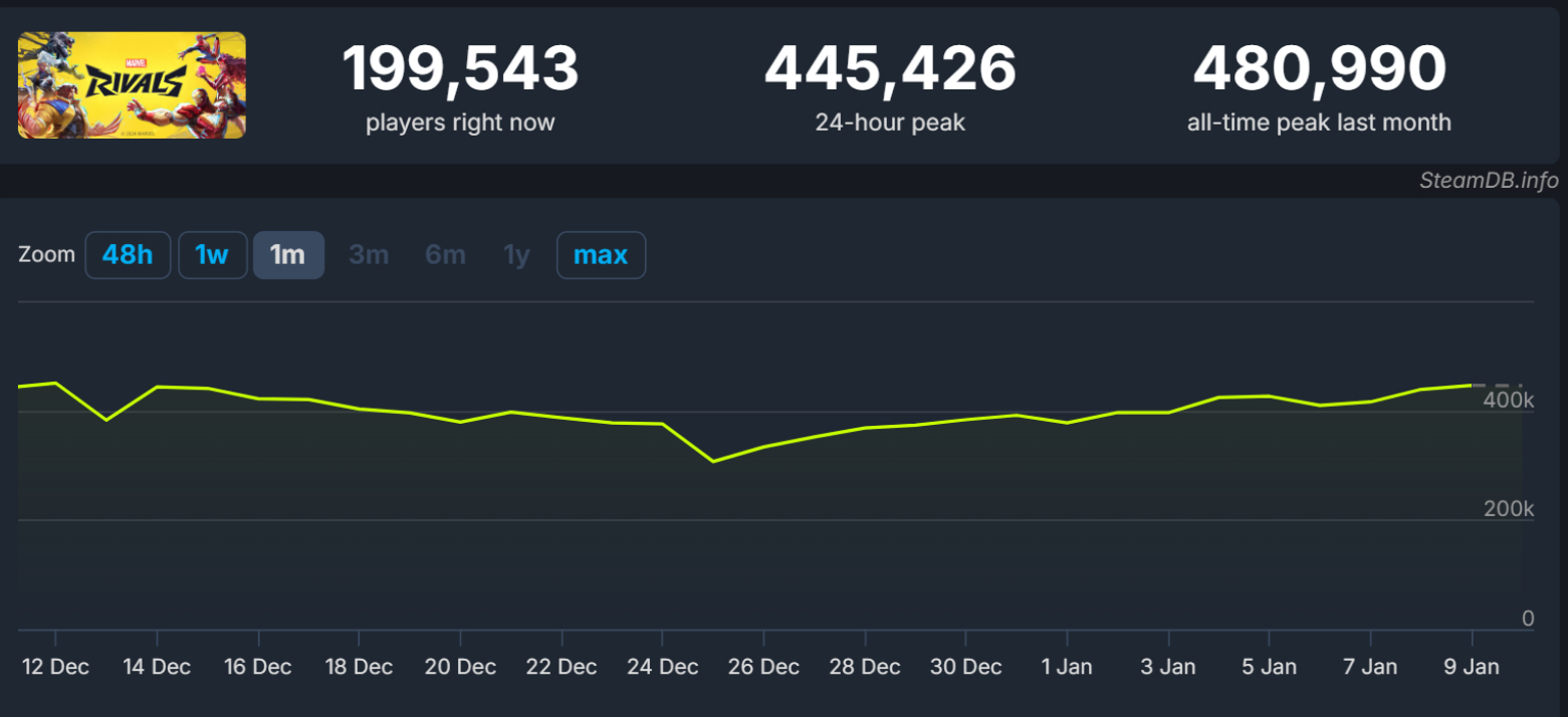 《漫威争锋》是一款免费游戏,盈利方式主要依靠战斗通行证、角色皮肤,以及跟游戏币相关的微交易。日均40万的玩家在线人数,保证了本作的流量和热度。截止到目前,《漫威争锋》的Steam好评率超过了80%。