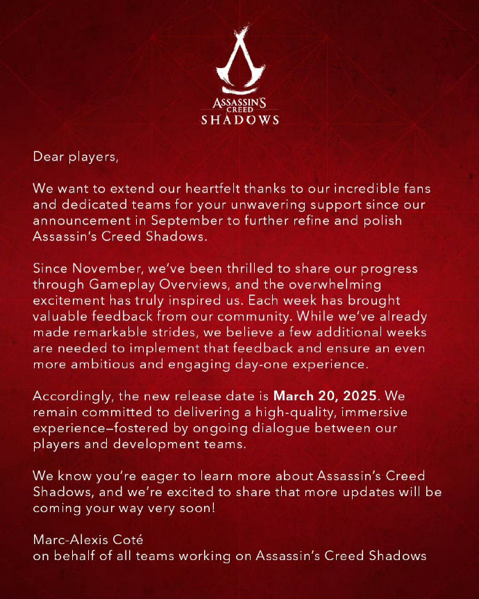 育碧官方解释:“亲爱的玩家们,我们衷心感谢令人难以置信的粉丝和敬业的团队们,自从我们9月发布公告以来,你们一直坚定不移地支持我们进一步完善和打磨《刺客信条:影》。”
