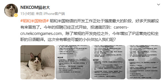 近期,《昭和米国物语》创意总监、CEO猫老大日前发布微博,称《昭和米国物语》的开发工作正处于强度最大的阶段,同时还公布了最新的招聘信息。除了常规的开发岗位之外,外增加了IP运营岗位和全职日语翻译。
