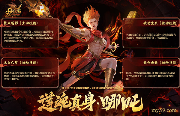 主动技能“焚天莲影”可让哪吒召唤分身对目标发动6段连击,炽焰般的攻击过后还将在范围内留下焚天烈焰,对进入阵内的对手持续造成魔法伤害。当哪吒阵亡时,被动技能“破劫重生”可重现哪吒金身重塑的不灭斗志,1分钟后即可复活归来。而哪吒的“三头六臂”则成为了突破伤害上限的被动技能,借助莲魂真身带来的力量,让哪吒“焚天莲影”的输出得以提升。而当“莲魂真身·哪吒”出征、合体或被任命为斗魂骑士/圣战骑士时,“我命由我”的战魂战技也将被激活,获得最为简单粗暴的额外战斗力加成!