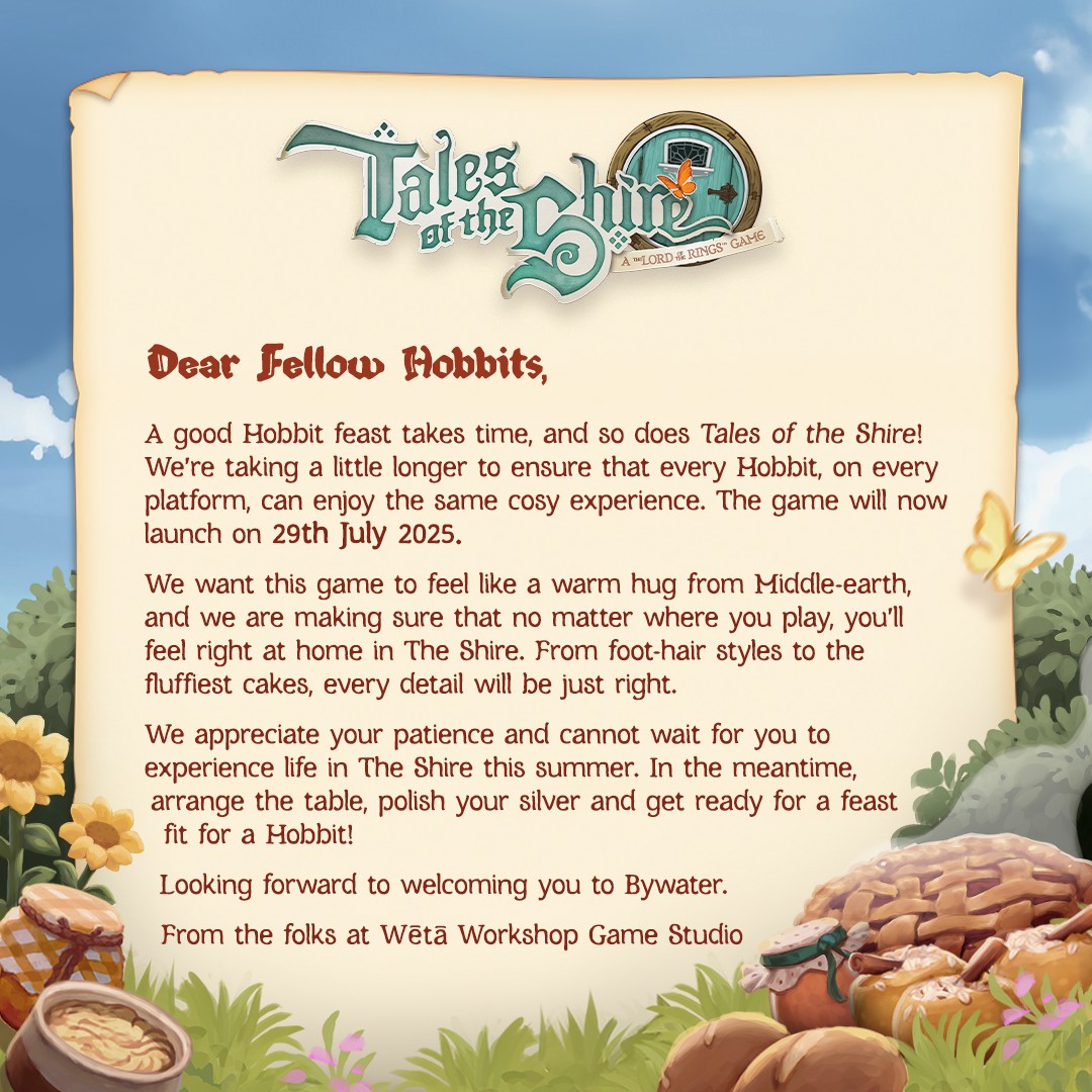 2月21日,发行商Private Division和开发商维塔工作室宣布,生活模拟游戏《指环王:夏尔传说》将延期至7月29日发售(Steam显示7月30日),该作原定于3月25日发售,登陆PS5、Xbox Series X|S、Switch和Steam,官方给出的延期理由是需要更多时间来确保每个平台上的玩家体验都同样舒适。