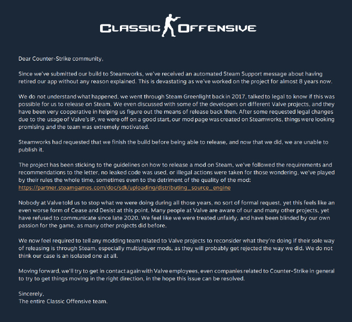 然而,这有可能只是开发者的一厢情愿。V社对《CS》玩家自制mod的上线,并未表明过开放态度。今年1月份,一款花费了8年时间开发的《CS:GO》经典攻势mod,就在上线前夕被喊停。
